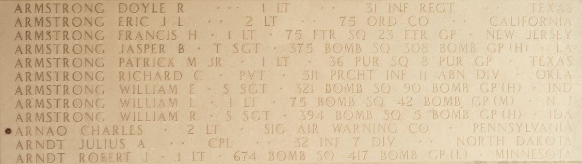 U.S. Army 2nd Lt. Charles Arnao, 30, of Philadelphia, killed during World War II, was accounted for March 18. Arnao was assigned to Signal Company, Aircraft Warning, Philippines Department on the Bataan Peninsula, in the Philippines.