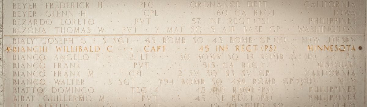 U.S. Army Capt. Willibald C. Bianchi, 29, killed during World War II, was accounted for Aug. 11. A Medal of Honor recipient, Bianchi served as commander of Company D, 1st Battalion, 45th Infantry Regiment, Philippine Scouts, on the Bataan Peninsula in the Philippines.