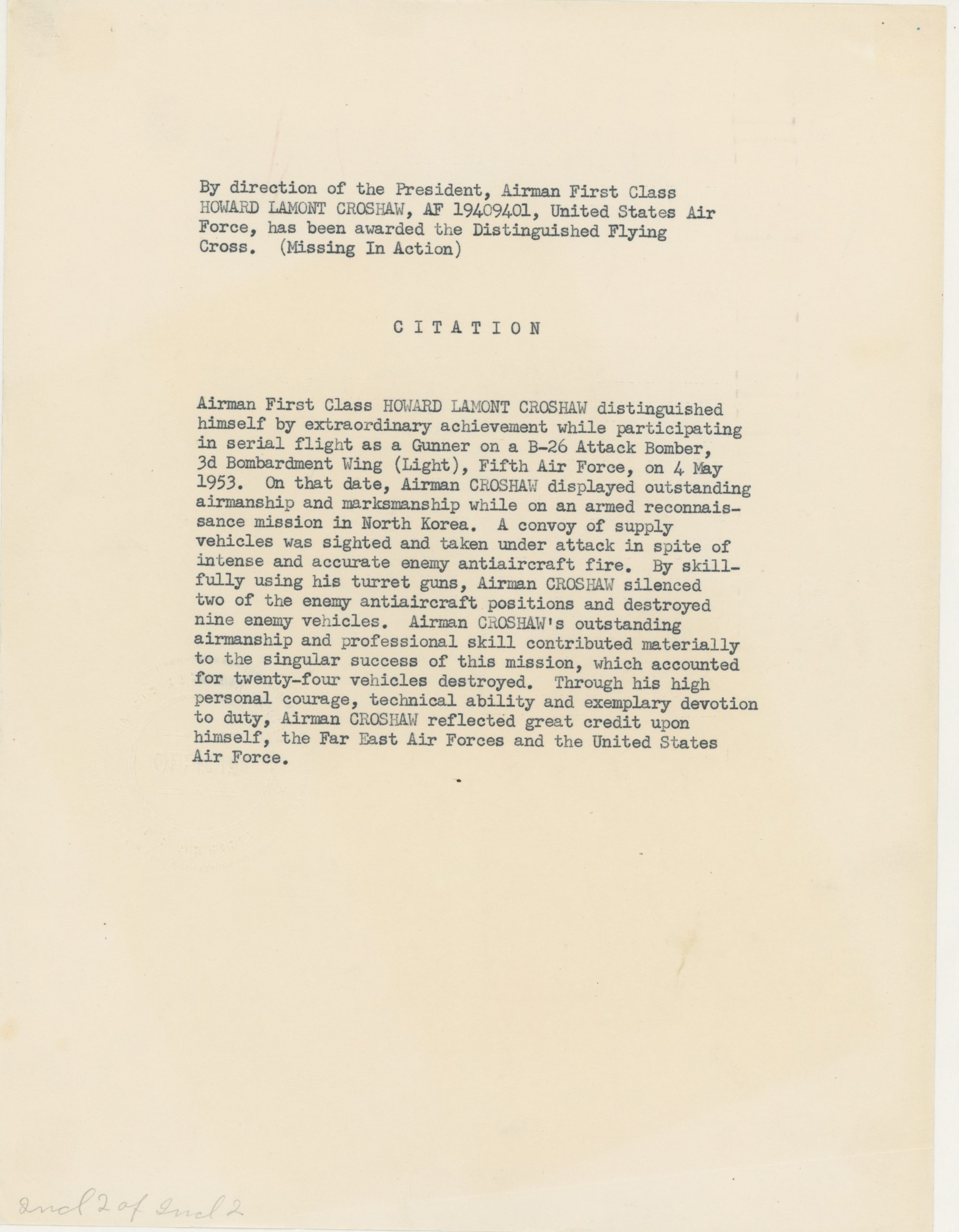 Airman First Class HOWARD LAMONT CROSHAW distinguished himself by extraordinary achievement while participating in serial flight as a Gunner on a B-26 Attack Bomber, 3d bombardment Wing (Light), Fifth Air force, on 4 May 1953. On that date, Airman CROSHAW displayed outstanding airmanship and marksmanship while on an armed reconnaissance mission in North Korea. A convoy of supply vehicles was sighted and taken under attack in spite of intense and accurate enemy antiaircraft fire. By skillfully using his turret guns, Airman CROSHAW silenced two of the enemy’s antiaircraft positions and destroyed nine enemy vehicles. Airman CROSHAW’S outstanding airmanship and professional skill contributed materially to the singular success of this mission, which accounted for twenty-four vehicles destroyed. Through his high personal courage, technical ability and exemplary devotion to duty, Airman CROSHAW reflected great credit upon himself, the Far East Air Forces and the United States Air Force.