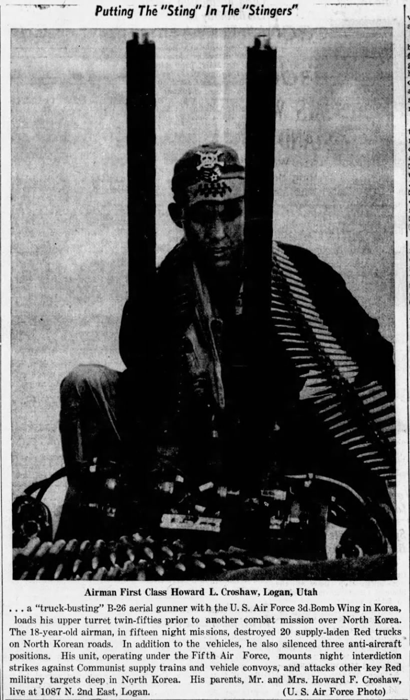 “Logan Flier Bags Trucks in Korea ‘Like Rabbits’” Ogden Standard-Examiner [Ogden, UT], May 5, 1953. Utah Digital Newspapers. https://newspapers.lib.utah.edu/details?id=25863545